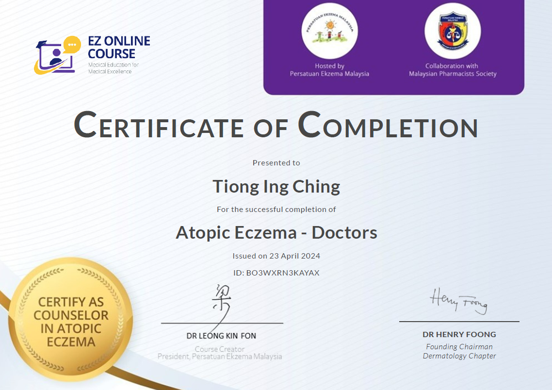 Dr Tiong has successfully completed Atopic Eczema – Doctors course and is certified as a counselor in atopic eczema. This course is hosted by Persatuan Eksema Malaysia, in collaboration with Dermatology Chapter, College of Physician, Academy of Medicine Malaysia.