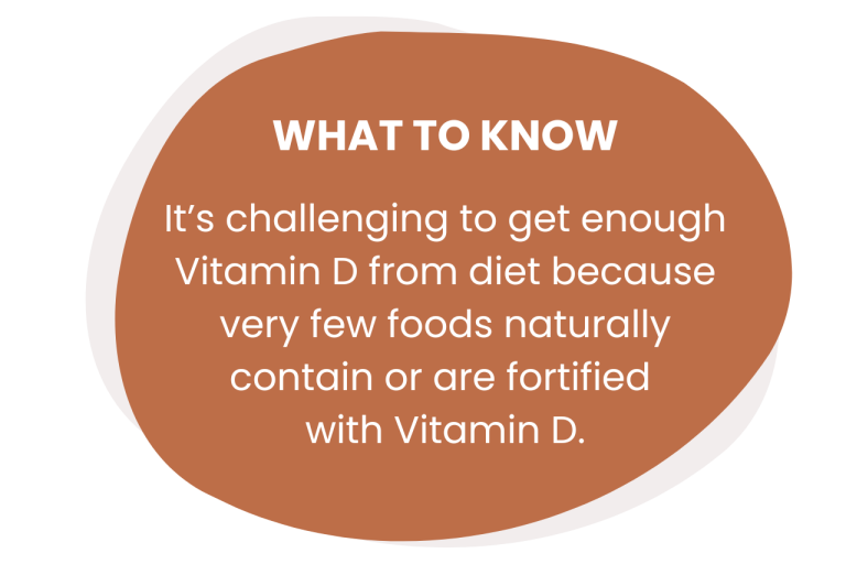 It’s challenging to get enough Vitamin D from diet because very few foods naturally contain or are fortified with Vitamin D.